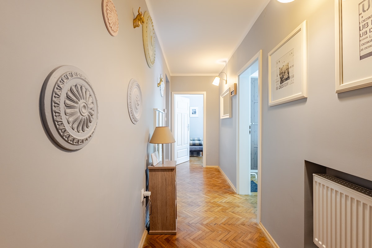 Eclectically decorated and very spacious apartment. 2 full sized bedrooms, large living room and all the modern amenities: Wifi, workspaces, smart TV/Netflix, Sound System. Fully equipped kitchen: microwave, full-sized oven, dishwasher, washing machine. Central heating: floor heating in the corridor & bathroom. Original restored all-natural wooden floors provide a cosy and relaxing atmosphere.