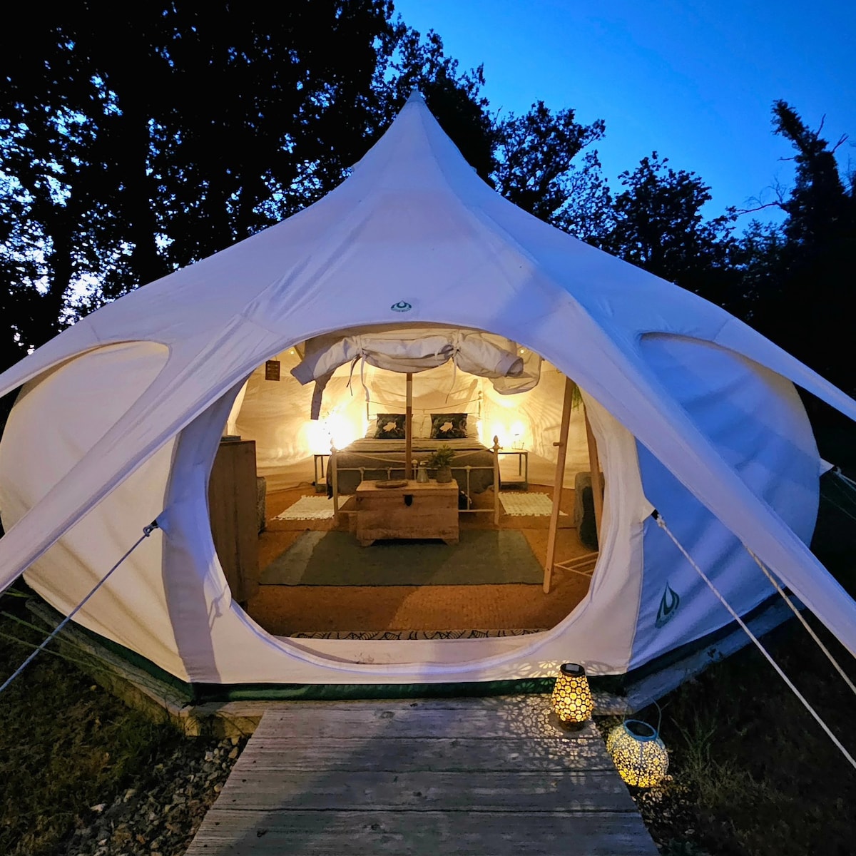 Luxury glamping Lotus Belle tent in the serene Corrézien countryside, ideal for couples or small families. On our small six-pitch campsite, the tent offers a calm, relaxing space with a comfortable bed, linens, and a private kitchen area. Enjoy our pool, on-site bar, and delicious pizzas, or wake to birdsong and explore nearby trails and villages. Unwind in the peaceful, private natural setting for a unique boutique glamping experience with full comfort.