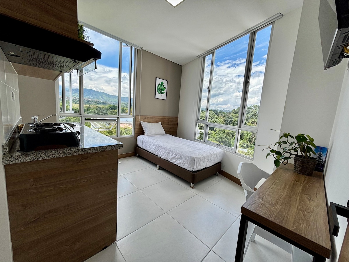Sitio mágico con una vista hermosa de la ciudad; esta es una oportunidad para hospedarse en las montañas del eje cafetero sin sacrificar comodidad, de iniciar el día con aire limpio y la vista de un hermoso amanecer, y si tiene la fortuna encontrará una noche llena de estrellas, con las luces de la ciudad a sus pies, una experiencia inolvidable