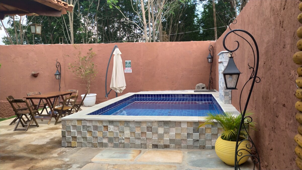 A great place for those looking for peace and quiet as we are located just 6 km (just 200 meters on a dirt road) from the Historic Center of Pirenópolis. -House with two en-suites - Air-conditioning in the bedrooms -Wi-Fi -Full Gourmet Kitchen - Recreation space (soccer/volleyball) -Solar heated pool - space for a bonfire - TV (bedrooms/leisure area) - hammocks for resting - A place with plenty of space and privacy -Location allows hiking in nature - Pets are welcome - Games