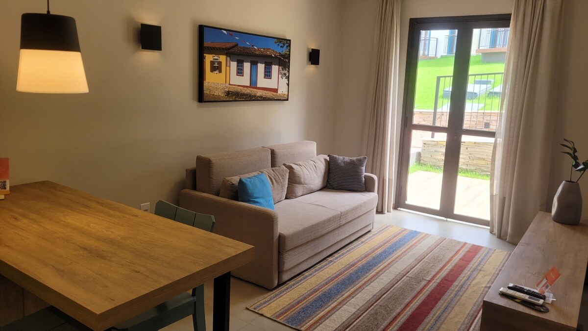 No detail goes unnoticed in this charming and sophisticated accommodation. Apartment for up to 4 people, new structure, in the best location of Pirenópolis, in front of the Bonfim church. The resort has 3 adult pools, 1 children's pool, a playroom, gym, multi-sports court, game room, spa, sauna, restaurant, bar, forest trail, bedding and towels included. Breakfast not included. We have the most beautiful sunset in Piri!!!
