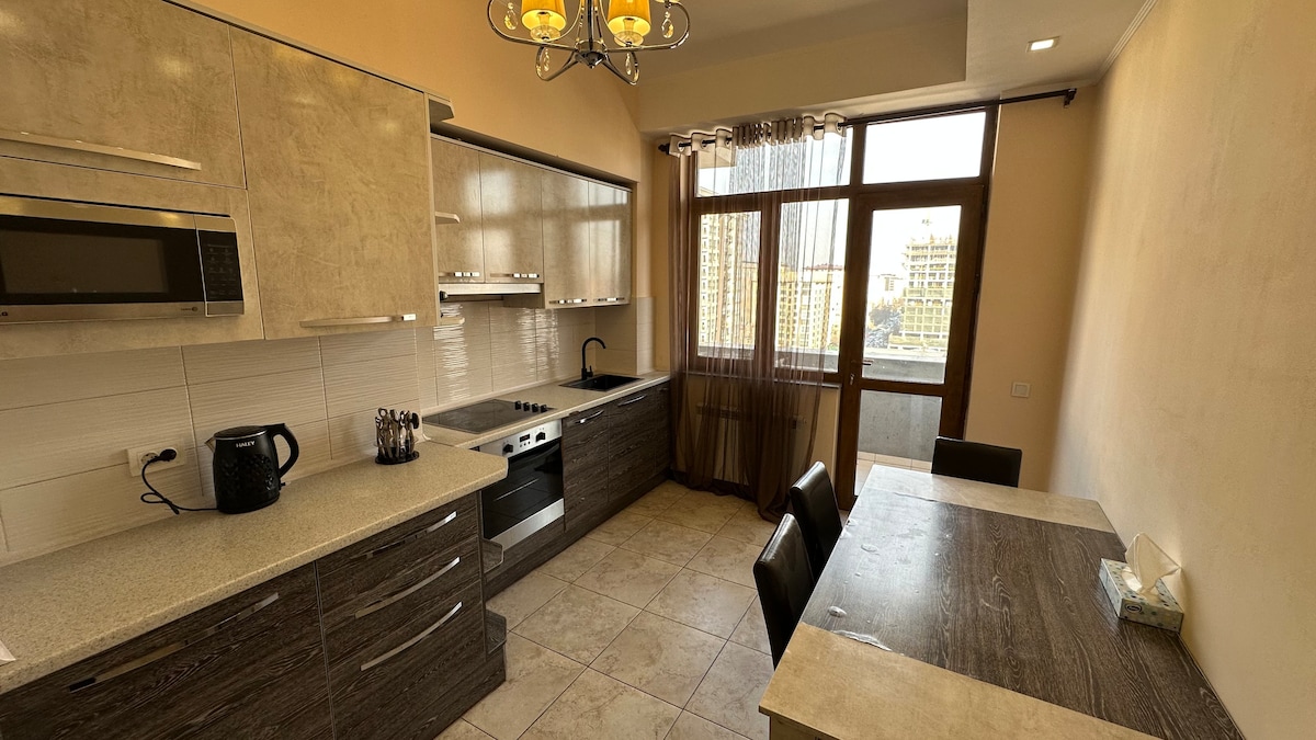 Beautiful spacious 3 Bedroom, 2 Bath apartment in the heart of downtown overlooking gorgeous mountains. Open space kitchen with high quality appliances. All rooms are air conditioned. Wi-Fi, cable TV. Two big TV screens. 24/7 on site security. Wonderful outside territory with a nice and secure play ground. Quiet area in walking distance from the main square, largest amusement park and good restaurants. English/Russian speaking hosts.