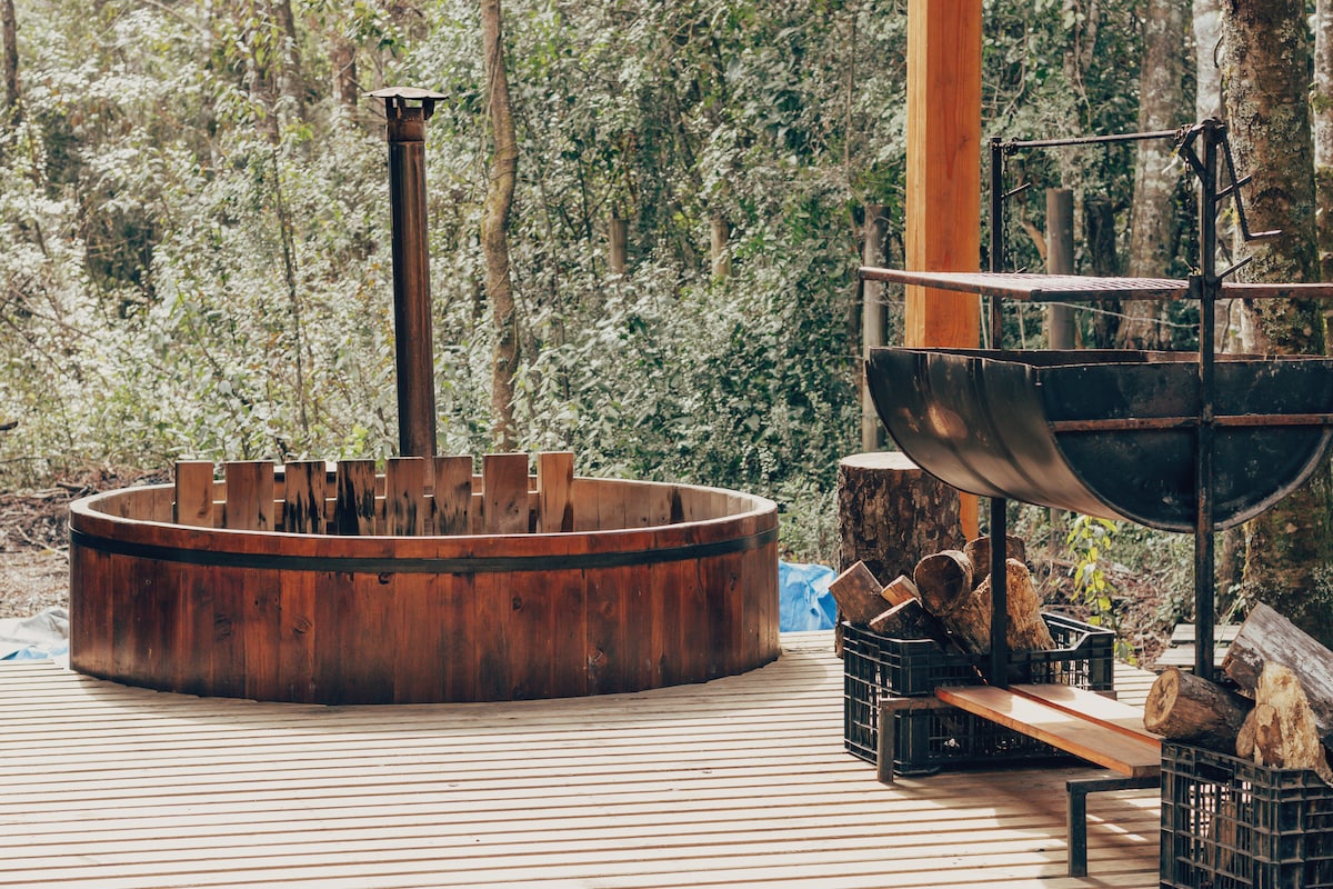 A cozy and comfortable cabin, walled by a private forest and close to the impressive El Claro waterfall. The place offers tranquility and natural beauty, while the cabin has a large terrace, with a grill for barbecues, Starlink Wi-Fi, a hot water jar, and a perfect environment for trekking and admirable nature