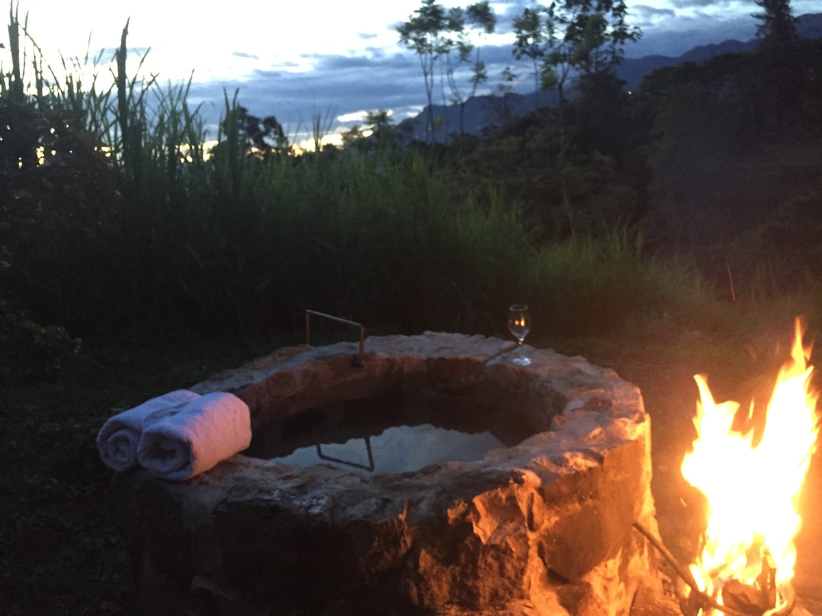 -Desconéctate de la ciudad en un hermoso glamping de guadua en medio de la naturaleza. Sin vecinos, ni ruido -Duerme al arrullo de la quebrada y despierta con el sol de la terraza de la habitación -Disfruta de un hot-tub de piedra de uso exclusivo -Aprovecha el aire libre y los jardines para pasear con tus mascotas -Chorrera en el jardín para bañarte -BBQ, cocina con estufa, nevera y utencilios -Electricidad, agua caliente, toallas y sábanas -Relax a 35 km de Bogotá -Domicilio de alimentos -Wifi