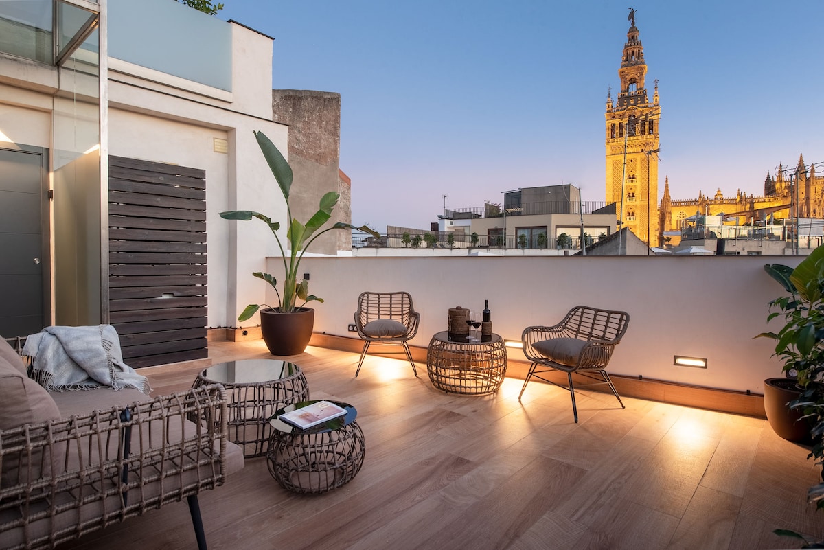This luxurious apartment is located in the heart of Seville, facing the three UNESCO World Heritage monuments: the Cathedral, the Giralda, the Archivo de Indias, and the Royal Alcázars. With a modern design, it features 1 bedroom, 1 bathroom, a living room with a Smart TV, and a fully equipped kitchen with high-end appliances, including a toaster, blender, oven, kettle, and Nespresso coffee maker. Additionally, it has a private terrace with stunning views of the city's main monuments.