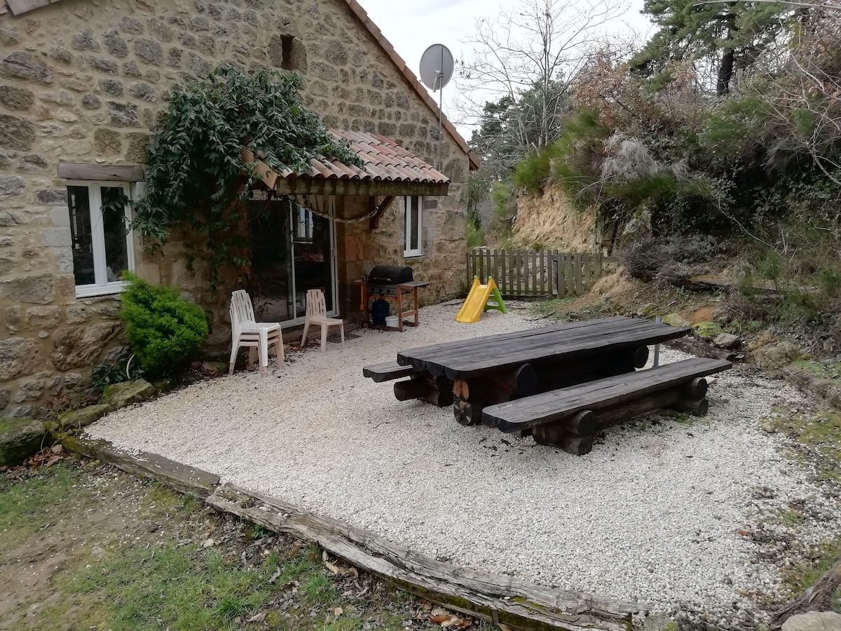 Atypical accommodation at the foot of the Tanargue. Old barn fully restored and perched on a hillside amid chestnut trees. Be charmed by a quiet stay of nature, with a river for swimming a 5-minute walk away. The accommodation is only accessible on foot by a rocky and steep hiking trail. The house is on 2 levels and can accommodate 4 people. Bed and bath linen is provided. SUMMER 2026: RENTAL FROM FRIDAY TO FRIDAY