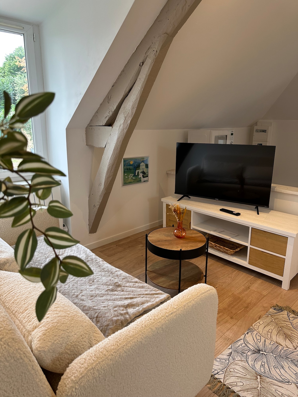 Studio-type accommodation on the ground floor of a house, equipped, with a separate entrance, a 160 x 200 cm bed, a shower room and a kitchenette. Spacious, peaceful, bright are the attractions of this room. Unique style to discover, renovated in the charm of the old, in the heart of a medieval village. Shops nearby, supermarket less than a kilometer away. Located 20 minutes by car from the 24 Hours of Le Mans circuit, 8 minutes from the European Horse Center.
