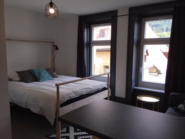 "Au 2ème" is a studio located on the 2nd floor in the center of Couvet at Grand-Rue 5, in an old renovated house. There is a kitchen with oven and fridge. There is TV, Wi-Fi and Netflix in the room. We don't offer breakfast. A bakery is 100 meters away. We have other rooms on AirBnB "on the 3rd", "on the 2nd suite", "on the 2nd east" and "on the 3rd east".