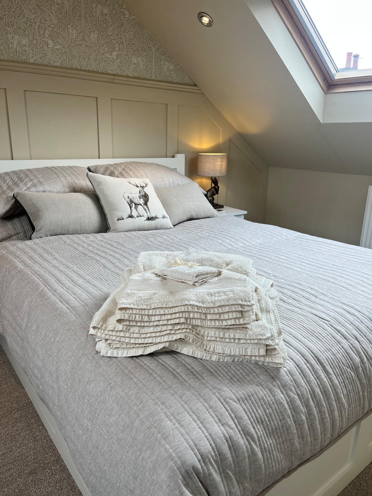 Our self contained studio room was converted from a sound proofed music studio and has been freshly decorated. It is connected to our garage, is separate from our house and has its own entrance and on street parking. Double bed, En Suite, Sitting area ,kitchen and entrance area. We have added a window to the flat after feedback from our guests.