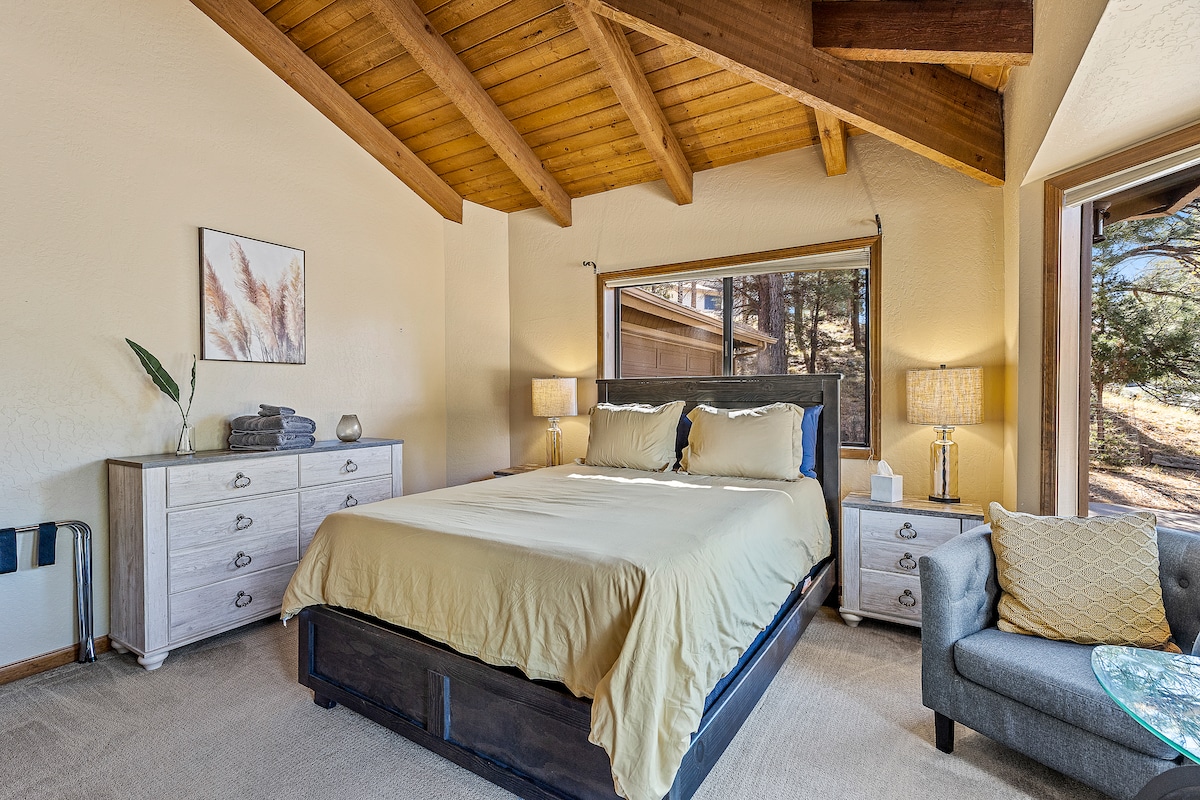 This southwest modern inspired home is the perfect getaway for those looking to surround themselves with the beauty and serenity of nature without sacrificing the comforts of home. This cabin lies in the heart of a quiet little cul-de-sac, but is a quick 10 minute drive from the energy and liveliness of downtown and many other popular destinations in Flagstaff like Snow Bowl. This neighborhood is known for its many grand homes and the variety of available trails for bikes and hikes. A/C Included