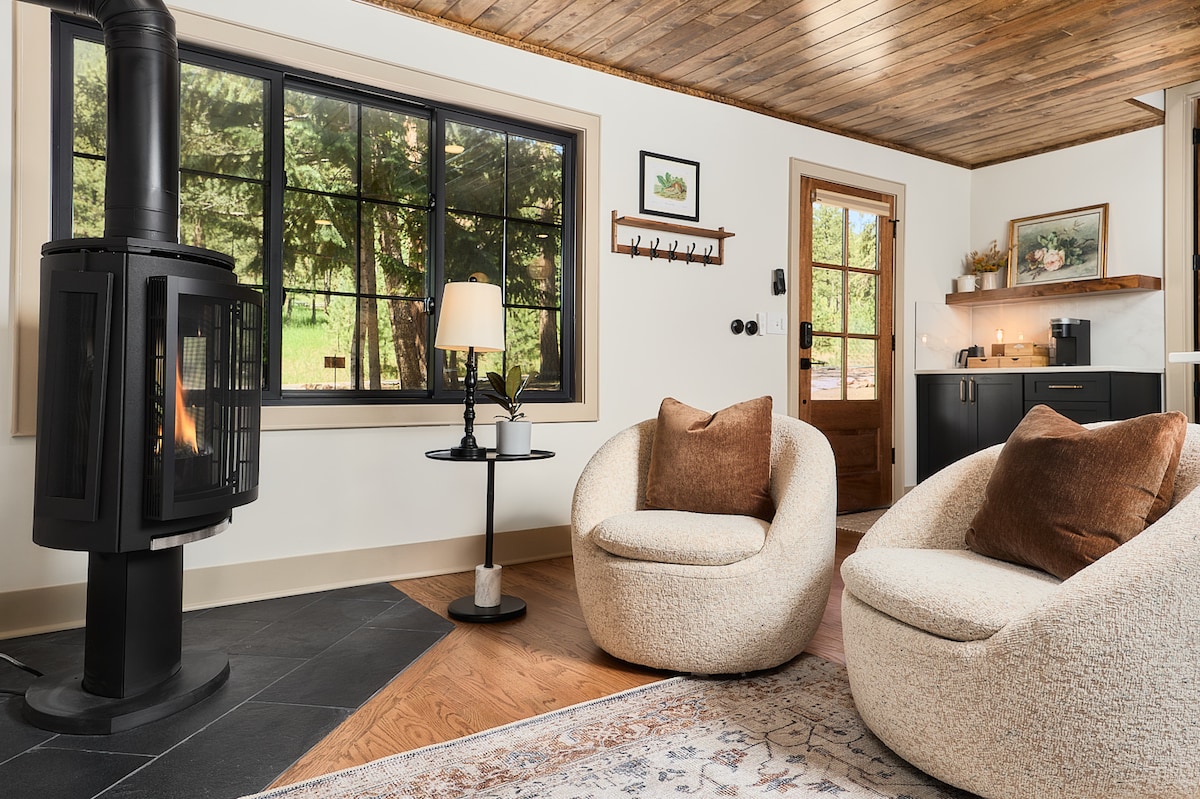 Immerse yourself in the wilderness of the Evergreen Rocky Mountains, yet still within reach of civilization. This tiny house cabin is nestled inside a forest and aspen grove, along a running stream. Curl up . Retreat to comfort and luxury, curled up on our uniquely designed window bench overlooking the scenery with a good book, cozy movie, and enjoy our custom dry sauna a window view as well. A tiny home in the midst of breathtaking views, fresh air, and serene nature.