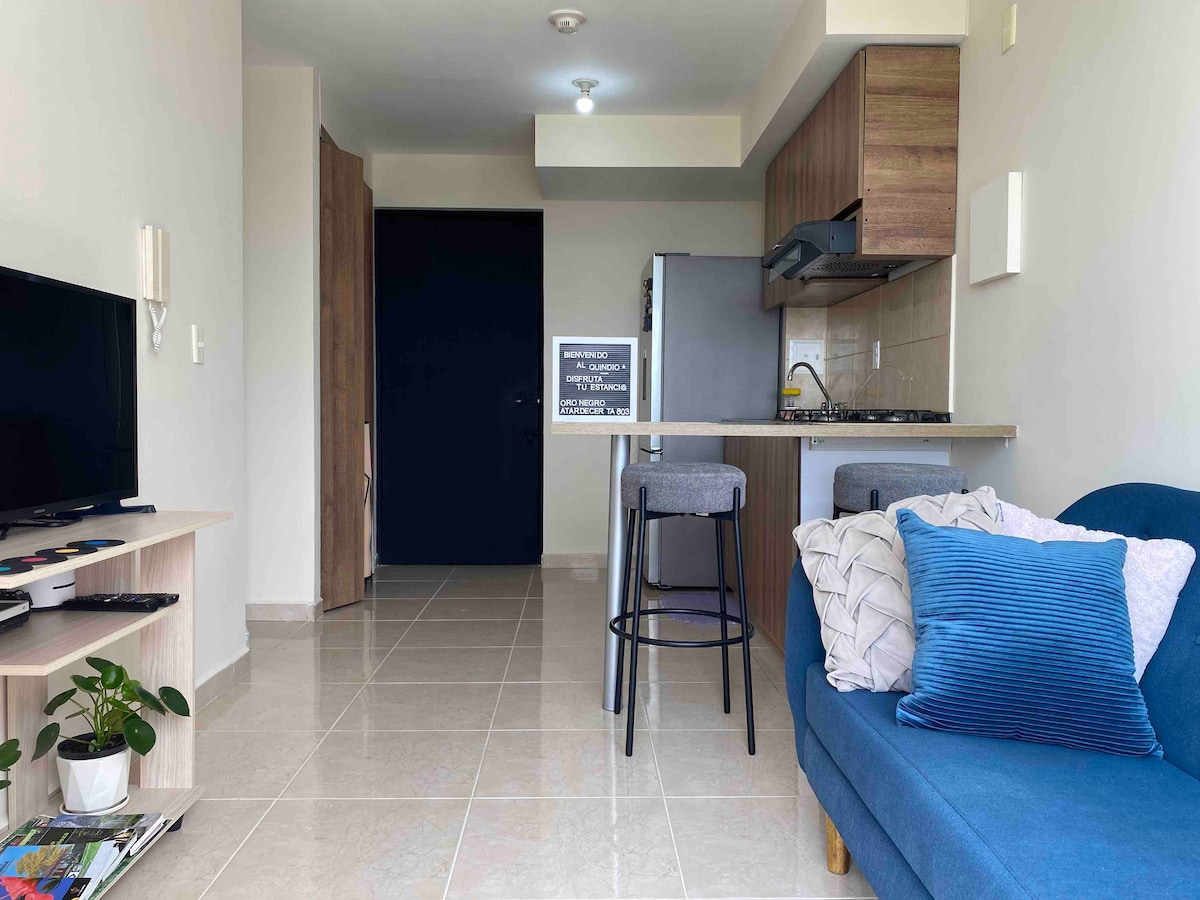 A studio apartment, located in the north of the city with nearby places such as: shopping centers, supermarkets, food establishments, CAI, bus stop, food mall, etc... The apto includes: smart 📺TV 🍿PLEX 📡wifi ☕️coffee maker, ❄️Refrigerator 👚Washing machine 🥤Blender, 🥪sandwichera 🥘pot 🍳pans 👩🍳kitchenware 🅿️Car and motorcycle parking 🏊♀️Pool (with a hat) (Monday maintenance) 🍀Green areas. 🛝Park
