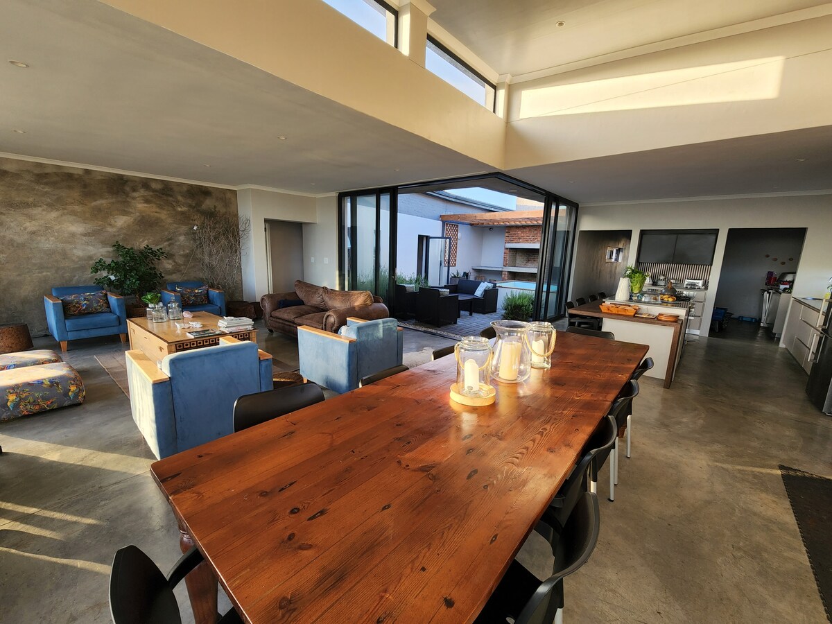 A big lavish holiday home with a partial seaview that is perfect for rest and relaxation. A group of friends or family will love the communal areas where one can dine, relax and create lasting memories. A highlight is the huge dining table in the open plan living area where guests can enjoy a family meal, play board games or just enjoy company. Pets are welcome. 🐾 Situated within walking distance from the beach and a restaurant in a quiet area with all the amenities you will need to unwind.
