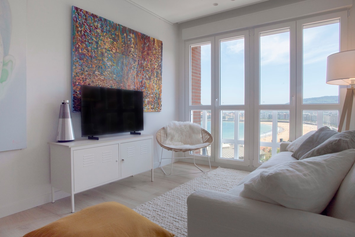 Cozy and cheerful apartment full of color and light to enjoy San Sebastian. Panoramic Sea views. Perfect dimensions. A few steps from the beach of La Concha and the city center. Divided into a spacious room with good closets, a spacious living room with a super comfortable sofa and modern paintings, an open kitchen with all the necessary appliances and top brands. Large bathroom, large shower, office space for the washing machine and the hot water heater. HIGH SPEED WIFI and BEO Sound Speakers.
