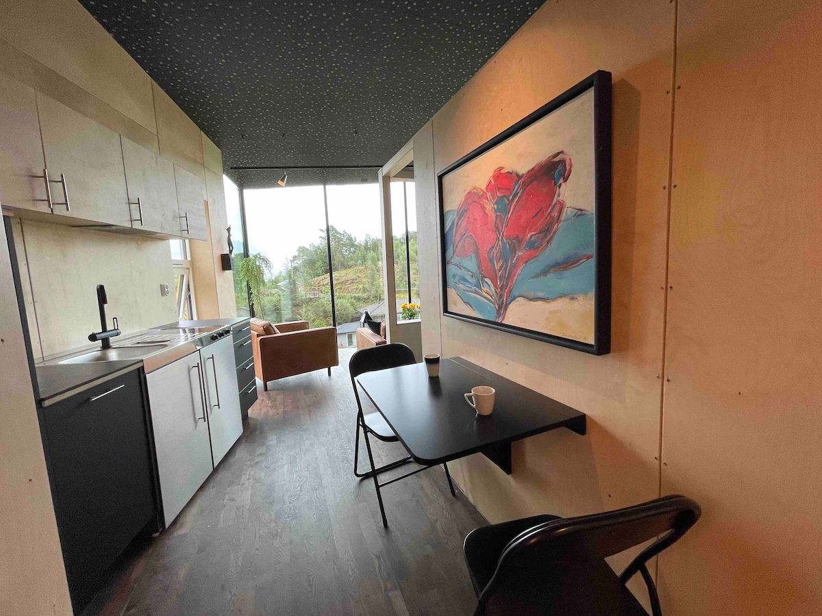 The micro house is located in peaceful and scenic surroundings in Solbakken farmyard on Os. In front of the house is Gallery Solbakkestova with its associated sculpture garden that is always open to the public. Around the house goats graze, and you have a view of some free-range chickens, and some alpacas on the other side of the road. The house has terraces on both sides, where it is lovely to sit and take in the surroundings and feel the peace. There are also great hiking trails nearby.