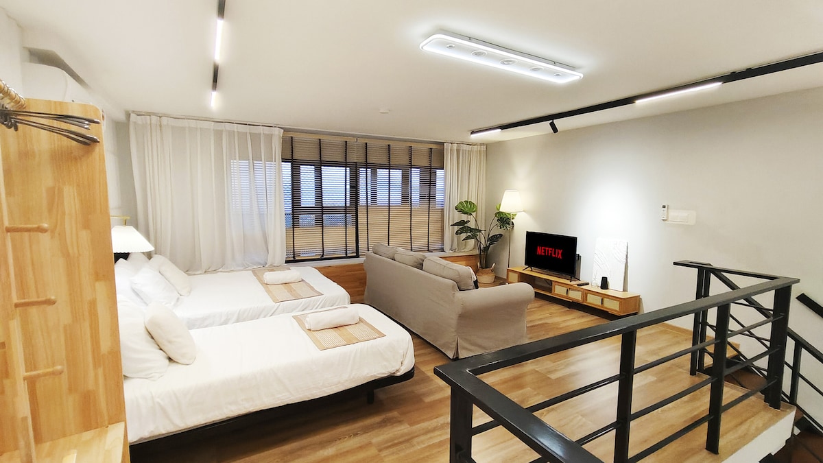 Welcome to our modern industrial-themed duplex, where urban comfort meets chic design. This unique space is ideal for up to 6 guests, providing a stylish and comfortable stay. Step into an industrial-inspired haven with exposed brick walls, sleek metal accents, and contemporary furnishings. The design is both trendy and cozy, creating a welcoming atmosphere. It direct access to EKO CHERAS MALL and link to MRT Station. A charming selection of cafes, bars, restaurants, and retail shops.