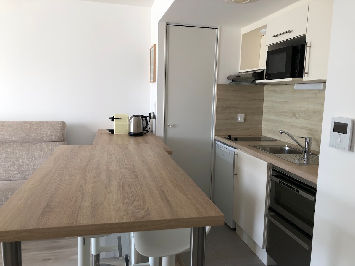Located 300 m from the village and the marina, this 43 m2 one-bedroom apartment is very bright and has a 13 m2 terrace. Entrance with cupboard, equipped kitchen open to the living room with sofa bed (140 x 190), 1 bedroom equipped with a 160 x 200 bed, dresser and large cupboard. Shared pool open from April to September. Private parking space in the basement. BED LINEN, TOWELS, tea towel and bath mat INCLUDED. Summer rental of 6 nights minimum starting Saturday.