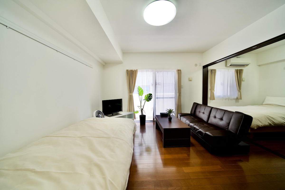 Beautiful 1 room [Pleased to meet you🙇♀️] Available in 3 languages: Japanese, English, and Chinese. Please read to the end. Our facility is a small family-run inn. We started with one private room and have grown to where we are now. We don't have soundproofing, daily cleaning, towel and sheet changes, or other services like a luxury resort hotel, but the room is 1.5 times the size of a regular hotel. We also have a free kitchen, washing machine, dryer, etc. to cover that. The facility is also 10 minutes by car from the airport and 5 minutes on foot from the station You can walk to Kokusai-dori Street. There are many places around the facility where you can enjoy 24-hour supermarkets, drinks and meals within a 1-minute walk. There is a large park in the back where children can play, and it is in a very good location. For those of you who are considering booking, our facility has received a lot of high ratings and good reviews compared to other hotels, despite the fact that we are self-service and have few other services like luxury hotels. We think that because we have been operating it by trial and error as a family, it is a facility with details and warmth that you can't find anywhere else. About the space It is a private apartment. The apartment has 2 large double beds and can accommodate up to 4 people. The building has an elevator, so it is convenient to move around with luggage. 1. Room Facilities Queen sized bed Sofa for 2 Table Bath Kitchen TV Toilet Washing machine Dryer Refrigerator Pots and frying pans Microwave Pot Heating and cooling Vacuum cleaner Dish rack Tableware Iron Ironing board Toothbrush Shampoo and soap Hair dryer Face towels Bath towels Fully equipped with all the necessities, including wifi. [Detailed basic information about the facility is as follows] 1. About the price The base price is per person. An additional fee of 1,500 yen per night will be charged for the second person. * Free for children 3 years old and younger. 1,000 yen for children 4 to 11 years old. 1,500 yen for children 12 years old and older. 1. Early check-in fee If you check in 1 hour early, we will charge 1,000 yen for the use of the room. * Check-in is from 3 pm We can accommodate check-in from 12: 00 at the earliest. Please contact us in advance as we may not be able to accommodate you depending on the cleaning status of the previous guest. Late check-out The basic check-out time is 10 am. A fee of 1,000 yen will be charged for a 1-hour delay. Maximum extension is until 1 pm. Also, please check in advance as late check-out may not be available depending on the cleaning staff's schedule. 1. About the luggage storage fee before check-in Up to 2 suitcases will be 1,000 yen. There is an additional fee of 500 yen per piece from the 3rd piece. * The staff will carry your luggage to the room where you will check in at 3 pm, so please check in at your convenience. 1. About luggage storage after check-out Available for 5 hours until 3 pm for 1,000 yen. The price is 1,000 yen for up to 2 suitcases From the third, it will be an additional 500 yen. * Available from 8: 30 am. Please be on time, as there will be a fee of 1,000 yen per hour if it is after 3 pm. Parking Parking is available 24 hours a day for 800 yen. * Please book by phone or email as there are a limited number. 1. Futon surcharge The basic rate includes two double-sized futons in the room. This is the price for up to 4 people. If you need an extra futon, it is available for 1,000 yen per futon. * It is 1000 yen until check-out. About renting a baby cot Available for 1000 yen per night. 1. Towels, bath towels and other additions Even for guests staying for consecutive nights, there is only one set of towels for the number of people. Therefore, detergent, washing machine and dryer are available free of charge in all rooms are installed! If you need more - 1 face towel ¥50 - 1 bath towel ¥100 - 1 set of toothbrushes ¥50 Available for purchase. 1. About check-in It is basically self-service. We will contact you the day before your stay with your room number and detailed check-in information. 1. Late check-out fee If you check out 1 hour late, you will be charged 1,000 yen for the use of the room. * Extensions are up to 1 pm. Please check in advance as late check-out may not be available due to the cleaning staff's schedule. About the cancellation policy Since our facility is operated by a different management company for fees and customer acquisition, we cannot refund cancellations due to typhoons and other circumstances. Therefore, please follow the rules. Lastly Our facility uses a deodorizing device that uses the power of ozone without chemicals, which was also featured on the famous Japanese TV program "Hokotate", to control influenza, norovirus and other germs and keep the room clean. Because we don't use chemicals, even newborn babies can stay safely. I think there are some shortcomings because we are keeping the staff to a minimum to reduce costs. However, we will do our best to support you. After booking, we will respond to all questions and problems by email or phone until the day of your stay, and we will respond to questions immediately unless we are sleeping. Okinawa is a very nice place with a good climate, and we look forward to your booking. [Very happy to meet you🙇♀️] We are a small family-run inn. We started from a room in a private home and have grown to our current size. Although there are no soundproofing facilities, daily cleaning, towels and bedding changes, etc. like luxury hotels, the rooms are 1.5 times larger than ordinary hotels. We also provide a free kitchen and washing machine/dryer. The facility is only 10 minutes by car from the airport and only 5 minutes on foot from the station. You can walk to Kokusai-dori, and there are many places nearby, including a 24-hour supermarket and places to enjoy drinks and food, which are a 1-minute walk away. There is even a large park behind the hotel where c