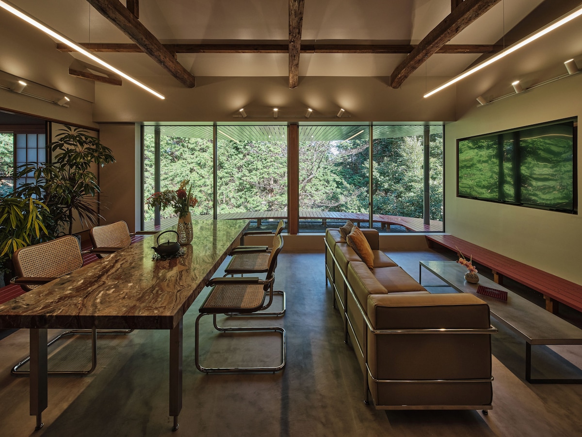 New facility now open! Hakone Sengokuhara Plateau: Entire house rental for up to 9 guests. Easily accessed from the city, this 4LDK (77㎡) retreat merges modern design with natural tranquility, ideal for families and groups. Features 3 free parking spaces, perfect for exploring Hakone. Enjoy modern amenities, including BBQ/terrace space and a projector for movie nights. Hakone Botanical Garden and Susuki Grass Field are within walking distance. Experience a luxurious, private stay in nature.