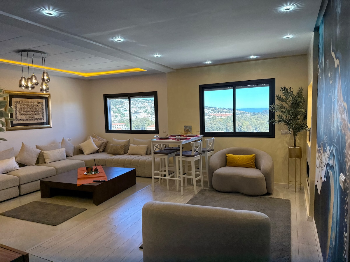 Discover our beautiful new apartment in Tangier with sea views. This modern home features two bedrooms, each with a balcony, two bathrooms, and a large living room with a 75-inch screen and Netflix. Kitchen is Fully stocked. Located close to all amenities, including a large mall, you won't need a car. The beach is a one-minute walk away and free underground parking is available with easy access. Enjoy a comfortable and relaxing stay