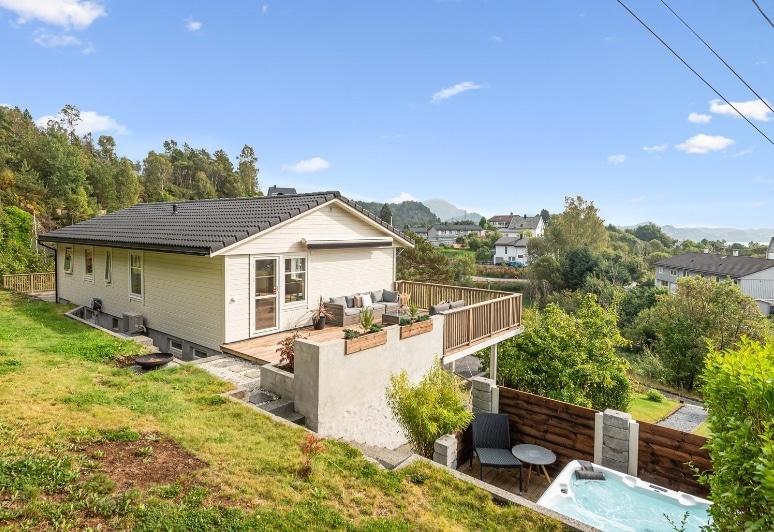 Experience paradise in our spacious home with a sea view. Enjoy panoramic vistas, fish on our shoreline, and unwind in the jacuzzi. Three bedrooms with comfy double beds, sleeping 8. Terrace with stunning sea views. Regardless of weather, bask in the sun or witness nature's might. House is peacefully located at the end of a private road. For ultimate tranquility, retreat to the gazebo at the edge of the terrace, by the sea. Just 30 minutes by car to Bergen city center.