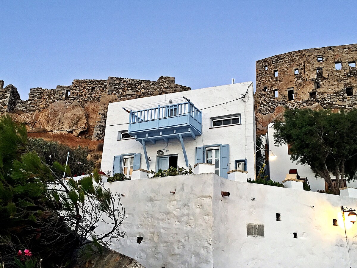 This lovely traditional house is situated under the castle. A traditional restored two floor house just 5 minutes from the central square of the island. Fully equipped kitchen, dining room and living room downstairs while upstairs is the bedroom and the balcony with magnificent view to the Aegean sea.