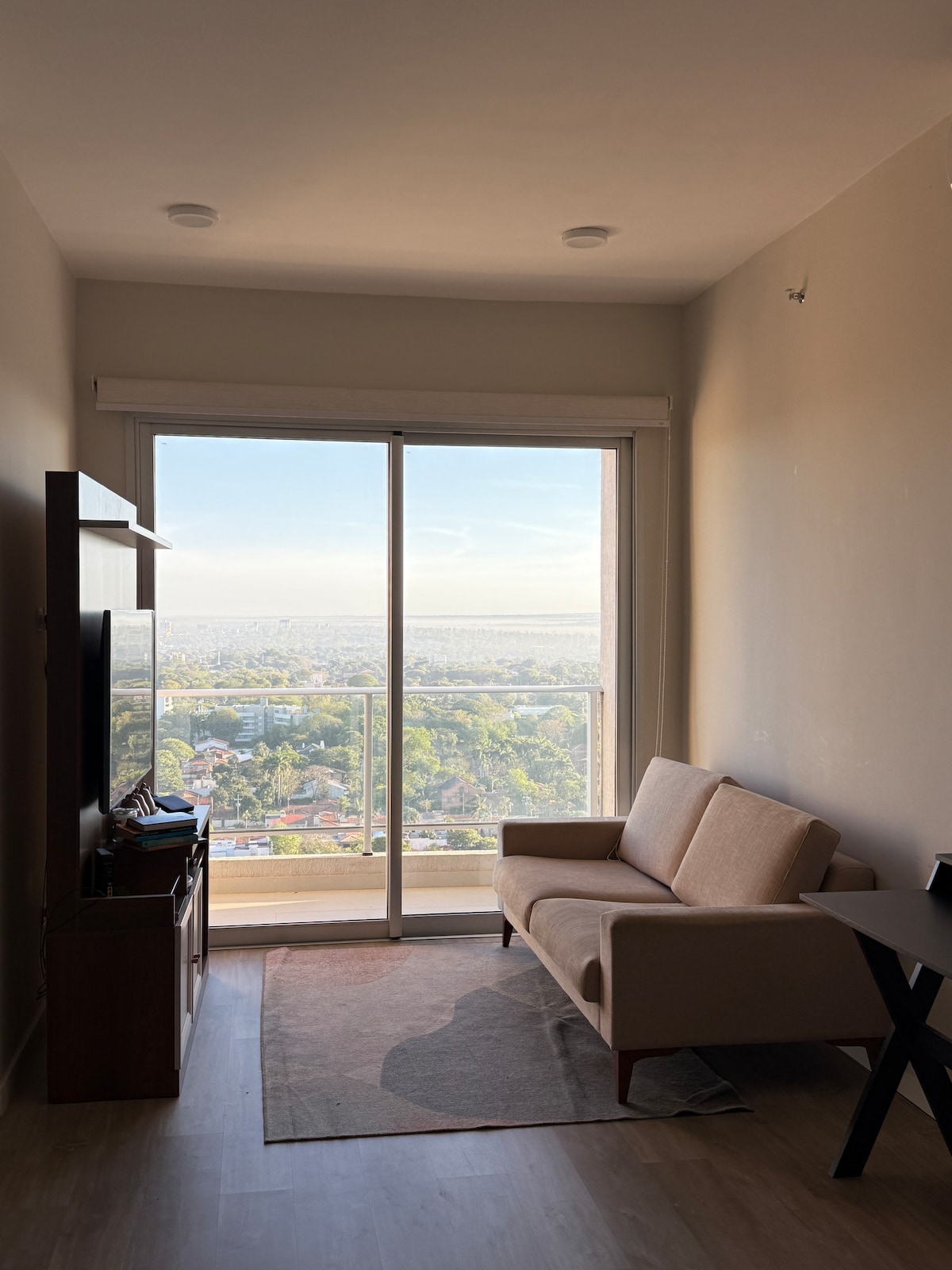 Departamento tipo loft a estrenar totalmente amoblado y equipado con todo lo que puedan precisar para una estadía cómoda y tranquila El edificio cuenta con una terraza amplia, varias parrillas, gimnasio al aire libre, parquecito que asegura la diversión para los niños y una vista imponente que permite ver una de las mejores puestas de sol que Asunción tiene para ofrecer. * PARA ESTADÍAS DE MÁS DE 30 DIAS CONSULTAR LAS OFERTAS ESPECIALES*