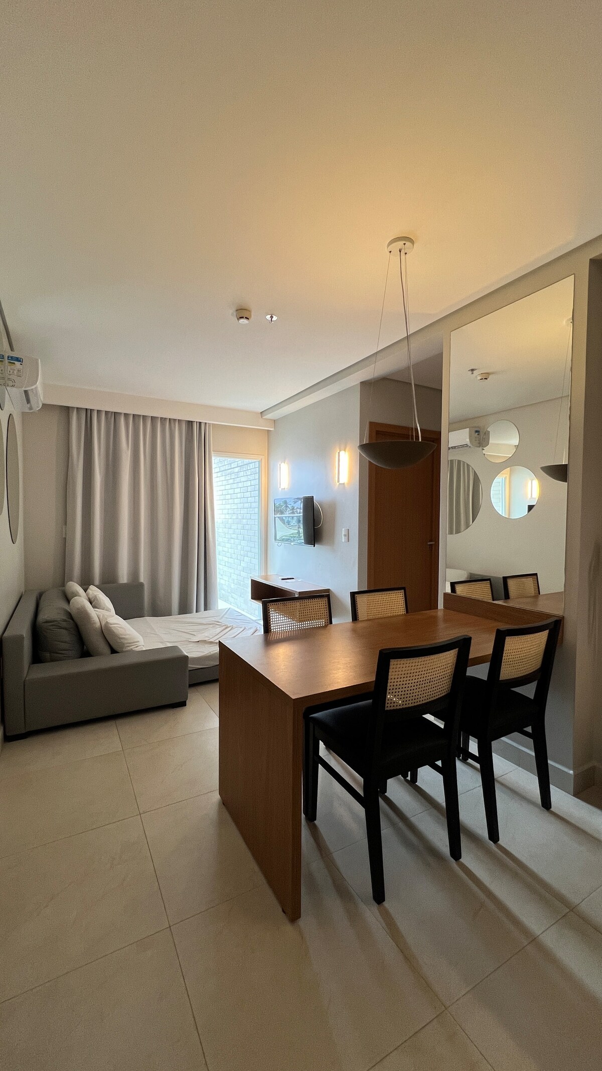 1/4 Apartment 30m² apartment with integrated American kitchen and living room, living room with sofa bed, 40” Smart TV and air-conditioning, kitchen with counter and stools, microwave, minibar and basic utensils, dishes, cutlery, glasses. Bedroom with double bed, 40” Smart TV, air-conditioning and balcony. The apartment has a bathroom, amenities and full linen. Free Wi-Fi in the apartment and social areas. Maximum capacity of 4 adults. Free access to the Resort's leisure area.