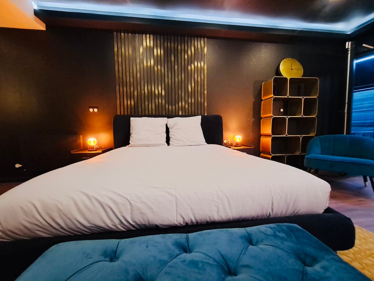 ❤️🔥 Discover the luxury Love Room VELVET & LEATHER at 20min from Paris, perfect for a romantic and sexy getaway ! 💎 Spa bath, private sauna, cloudy-effect king-size bed, stripping bar, tantra sofa, etc. 💋 Explore new sensations and create unforgettable memories together in the incredibly equipped secret BDSM playroom space 🎬 92" Cinema face to the bed with Netflix, Prime Vidéo, Disney+, Spotify 💫 Escape to a haven of peace and luxury for a unique and memorable experience !