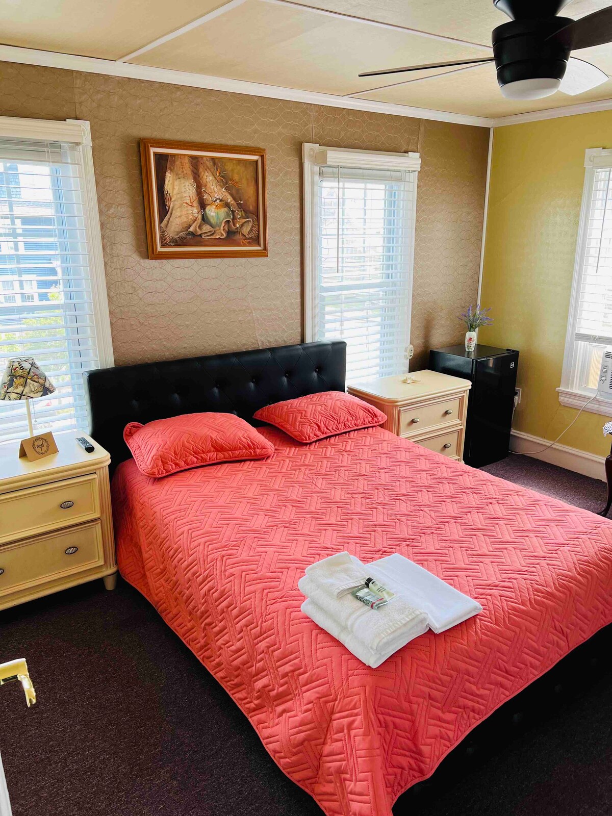 As part of our thoughtfully restored 1950's Boutique Inn, the Zenneth Manor, your cozy room is light, bright & airy. Our laid back 2nd floor room is only 1 BLOCK to beach & boards. Your room features two double beds, private bath, individually controlled AC, a flat screen TV & mini refrigerator. We offer FREE PARKING onsite, use of complimentary beach tags, Wifi, coffee & tea in the AM, & daily maid service. Enjoy easy access to popular shops & restaurants within easy walking distance.