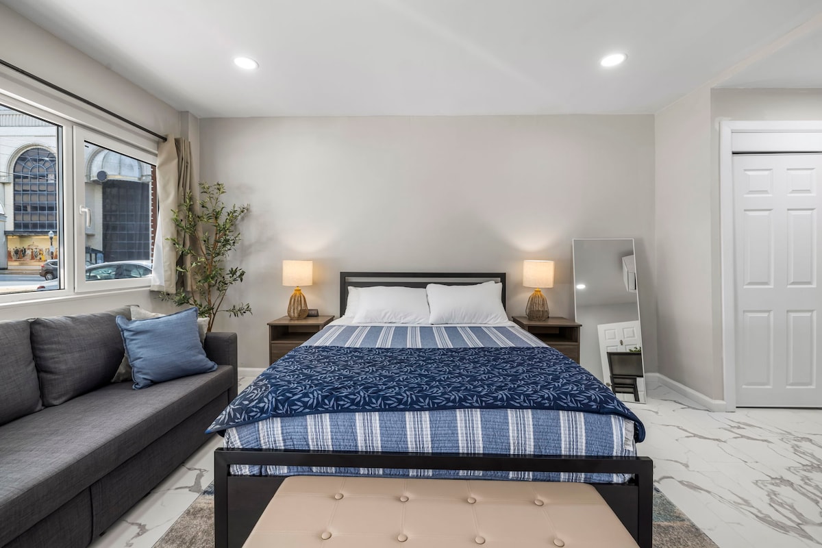New Listing! A newly renovated studio-condo just one block from the beach/boardwalk and just minutes walk from Tropicana Casino and Stockton University! This studio is equipped with all basic necessities. The kitchen has a built-in glass cooktop with 2 burners, a mini refrigerator, and a coffee pot. There is a comfortable Queen size bed with a memory foam mattress along with a pullout sofa bed and a Roku 65” flat screen TV. There is a couples dining table that also doubles as a workspace