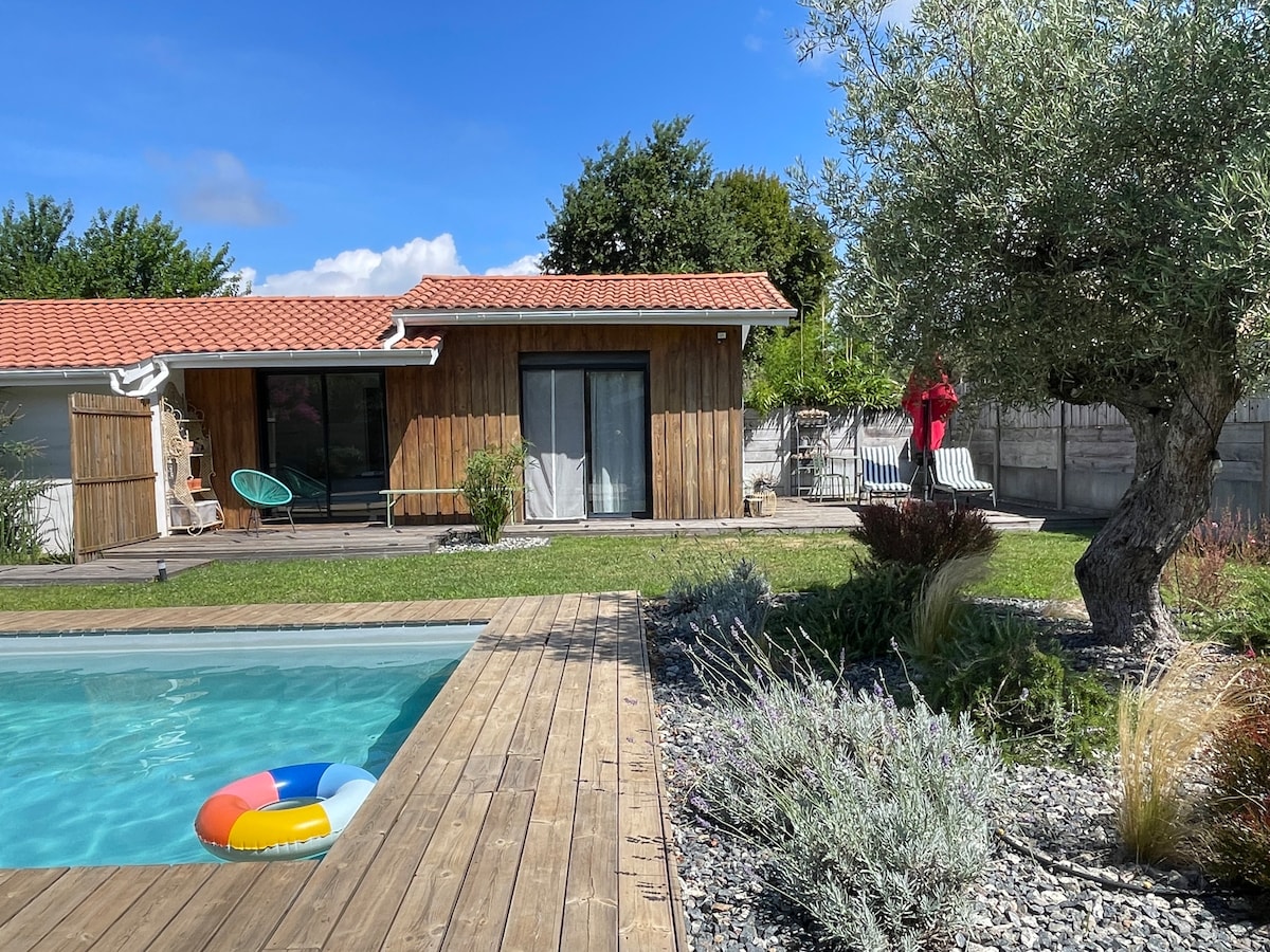 Enjoy a charming independent house of 30 m2 with 1 bedroom, a living room / fully equipped kitchen (with basic kit provided) and a terrace of 40 m2 overlooking our garden. 3 stars accomodation acording to Gironde Tourisme. Ideally located, the house is 5 mn walk from the shops and 5 mn by bike from the Bassin d'Arcachon and the Domaine de Certes. In 1/2 hour by car, you can reach the ocean beaches as well as Le Cap Ferret, Arcachon or Bordeaux. All the ingredients for a pleasant stay !