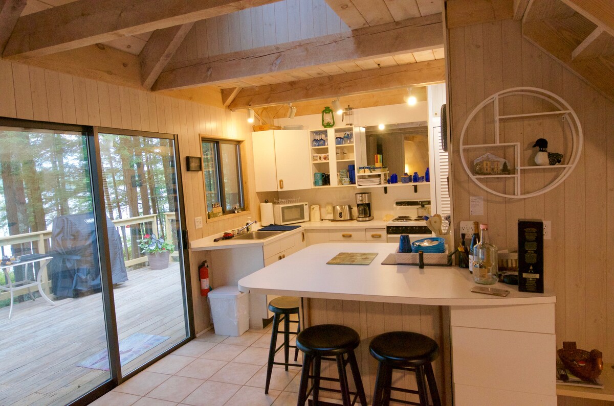 This is where you want to stay! Away from all the traffic and noise of HWY 1, down a long driveway but super close to the village. Perched on the hillside with elevated panoramic views of the river and Wiscasset Harbor. This adorable little building is post and beam construction - comfy, quiet, peaceful on 34 acres of woodlands and river front. Want to squeeze in more kids? Talk to us. 2 quiet nonaggressive furry friends welcome. $20 per nt. per pet paid on arrival. Max pet fee $100.