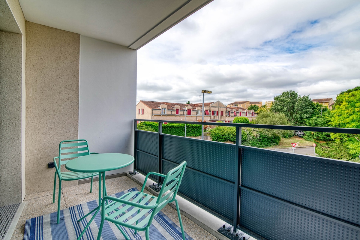 Enjoy a large 53 m2 independent and fully furnished apartment, with balcony overlooking a park in the city center. Configuration for 2-4 people, 1 double bed + sofa bed. Access to shops 50 m away (restaurants, bakery, organic Superette, Carrefour City, greengrocer, butcher, bank, post office...) The bus is in front of the residence and takes you in less than 15 minutes to the metro Ideally located close to Toulouse, Blagnac Airport, easy access bypass.