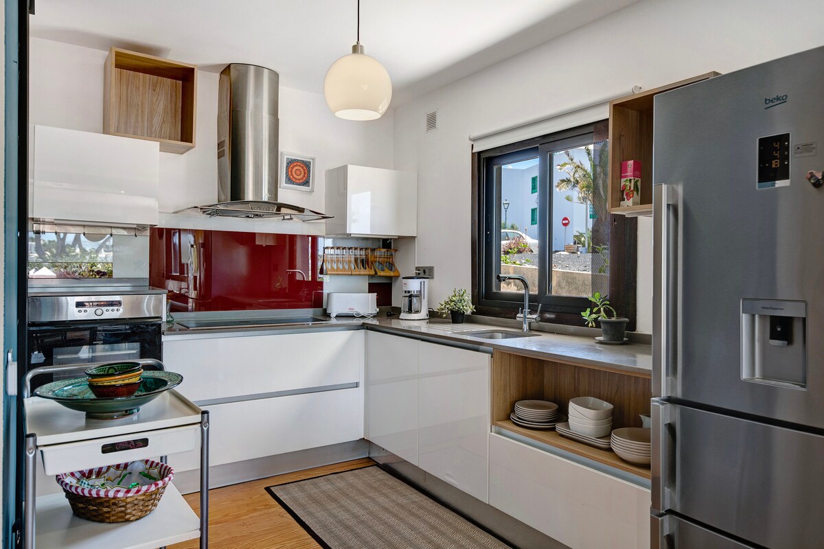 Duplex located in a quiet and safe complex close to shops and restaurants, the water park, and the golf course. The beach is 15 min. on foot, with a beautiful seaside walk. Opposite the complex there is a small supermarket and the Santa Rosa Sport gym is 10 minutes away. There is a bus stop just 5 minutes away with buses running to Arrecife Capital, meaning that one can get by without an auto; if you do want to rent one, there is a free parking space in front of the house.