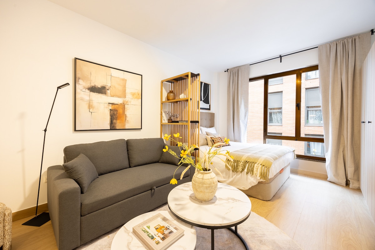 Enjoy your stay in Madrid in a luxury apartment with everything you need to feel right at home. It is literally a 2-minute walk from Santiago Bernabéu and very well connected to the museum area, the best shopping areas, and downtown Madrid. Great gastronomic offer in the neighborhood. When you return home, rest in this 40 square meter apartment, with a double bedroom, a full independent bathroom and a fully equipped kitchen integrated into the living room.