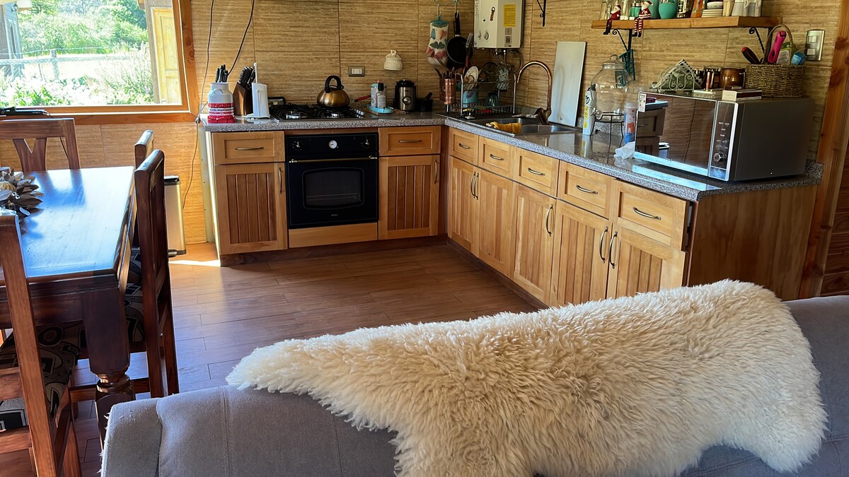 Hermosa cabaña -Martín Pescador- de madera tejuela de 55 mts2 con 2 habitaciones, una con cama matrimonial de 2 plazas y otra con cama plaza y media más cama nido de una plaza. Calefacción con radiador eléctrico y adicional calefacción a Pellet central. Amplio baño con lavadora incluida. Cocina equipada y Frigobar. Excelente construcción con aislación térmica, piso de madera y todos los ventanales en Termopanel. Opción de un excelente desayuno por $7.500 pesos chilenos p/p.