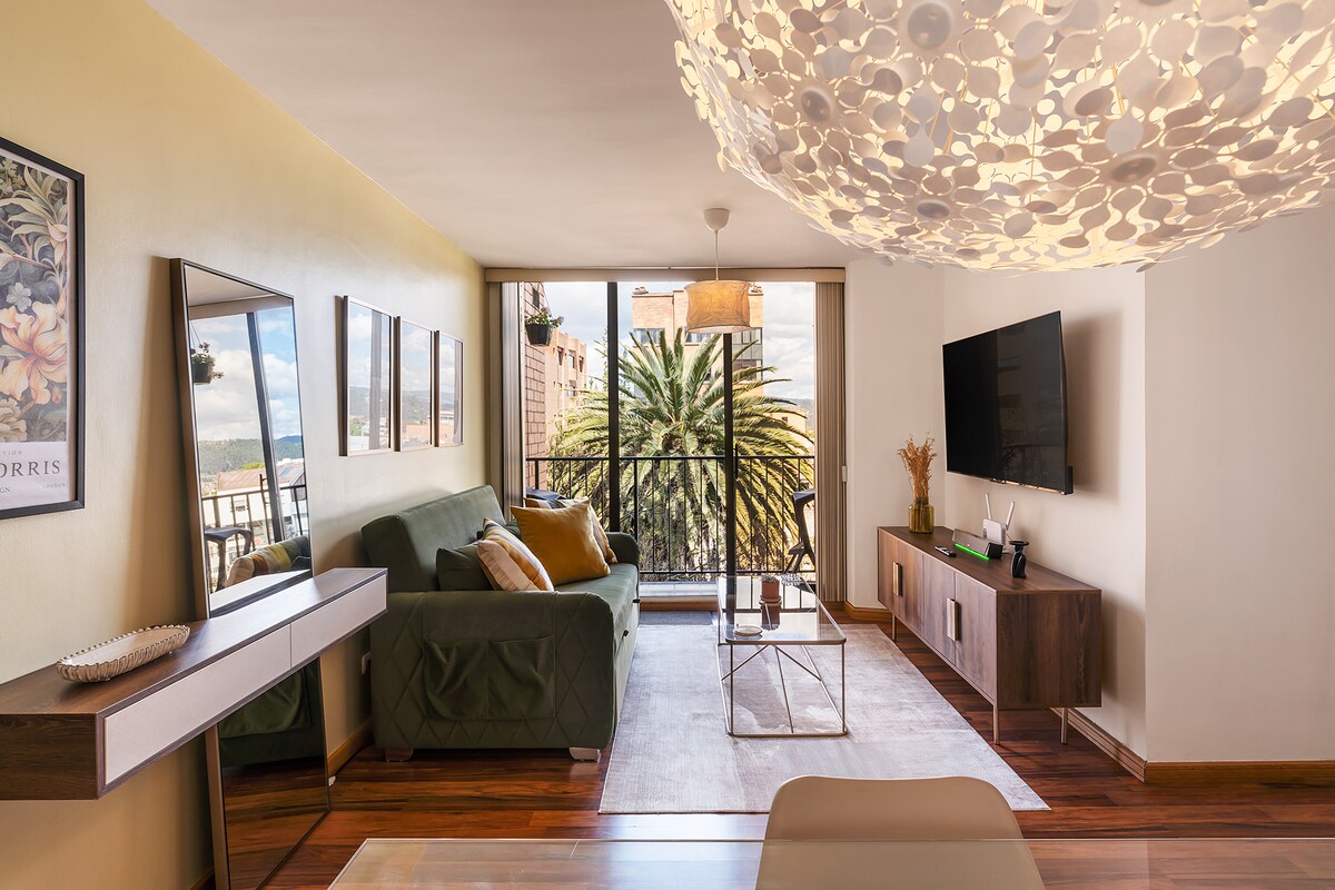 Relax with the whole family in our Fashion & Design Apartment, just a 5-minute walk from Plaza Calderón, the most beautiful square in Cuenca. This meticulously curated accommodation offers: 1 Cozy living area with sofa and TV; 1 Fully equipped kitchen; 1 Desk for remote work; 1 Master bedroom with terrace; 1 Second bedroom with full-size bed and terrace; 1 Modern bathroom with shower; Mariscal Lamar Airport is 3.2 km away. Book your tranquil oasis now!