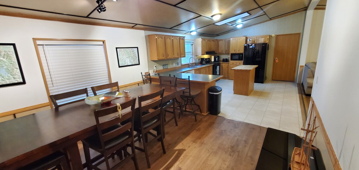 The whole group will enjoy easy access to everything from this centrally located place. Very well located one of the closest houses to Many Glacier entrance . Walking distance to Cattle Baron restaurant , Glacier edge cafe Thronsons general store and Post office. The house is set back off the road so makes it quiet and private 17 acres. 2 separate sitting areas with to large couch's The house is not down a dirt rough road like many properties in the area
