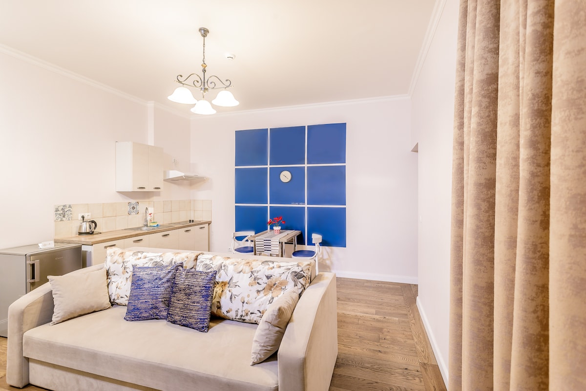 Насладитесь стильным и тихим отдыхом в центре города. Апартаменты с балконом, расположенные в здании реставрированным под жильё высокого уровня комфорта. Апартаменты расположены рядом со старым городом и Верманским парком и имеют выход в тихий двор что позволяет наслаждаться тишиной и покоем находясь в центре города. Площадь апартаментов 55 м2, они имеют отдельную спальню, гостинную зону с кухней и санузел с душевой кабиной. В апартаментах есть всё необходимое для комфортного проживания.