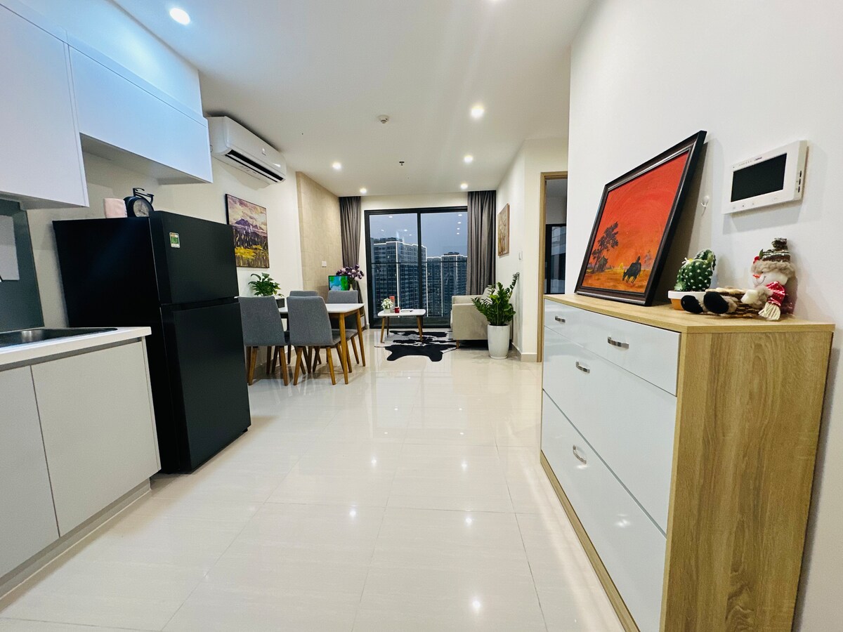 Welcome to the stunning apartment in the most luxurious subdivision of Masteri Ocean Park. Spacious space full of living amenities with two exquisitely designed bedrooms. The apartment features convenient self check-in/check-out, allowing you to be flexible with your plans. You will enjoy top-notch amenities, including an infinity pool, a beautiful lake, and luxurious restaurants. 24/7 security and absolute privacy help you relax and enjoy life.