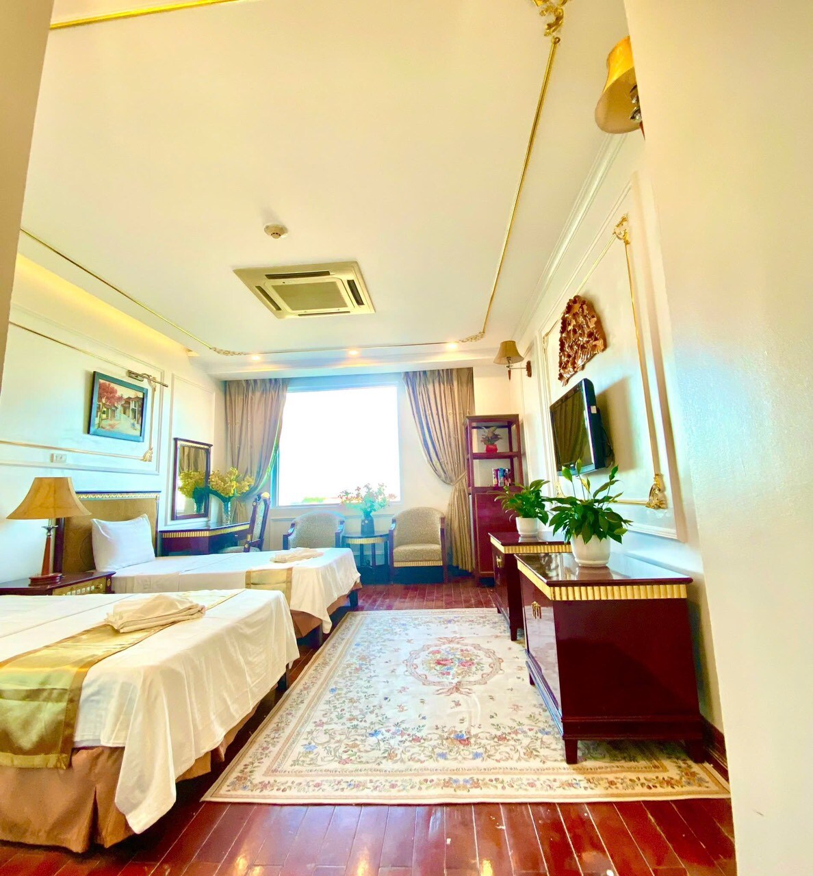 The room has a luxurious neo-classical style. The highlight is the large bed upholstered in noble blue velvet, combined with gold on the ceiling and walls to create a splendid feeling like a palace. The space is well arranged, including: ✅ Resting area with a soft bed, comfortable long bench, dressing table and large mirror. ✅ Modern glass bathroom with luxurious bathtub, high-end shower, round LED mirror, hair dryer and full amenities. ✅ Relaxation corner with two classic armchairs, tea table and soft drinks.
