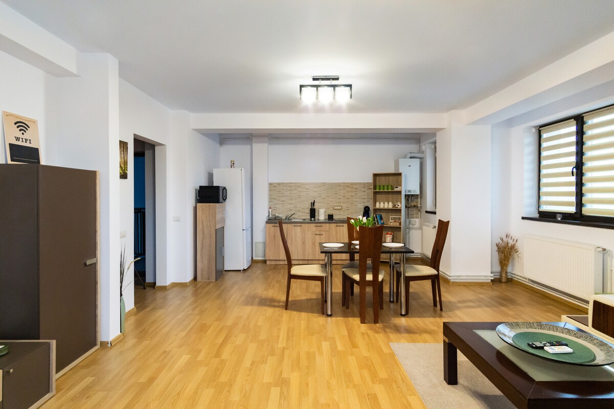 Our newest apartment fully equipped with custom made furniture is waiting to host your relaxing holidays. Located at the top floor of a new building right nearby the city center of Bacau. Our apartment provides you with everything you need during a long or short stay . The apartment is fully equipped with a kitchen that has all the high end appliances : oven , stove , microwave, coffee machine , tea , flat screen TV with Netflix , washing machine, AC.