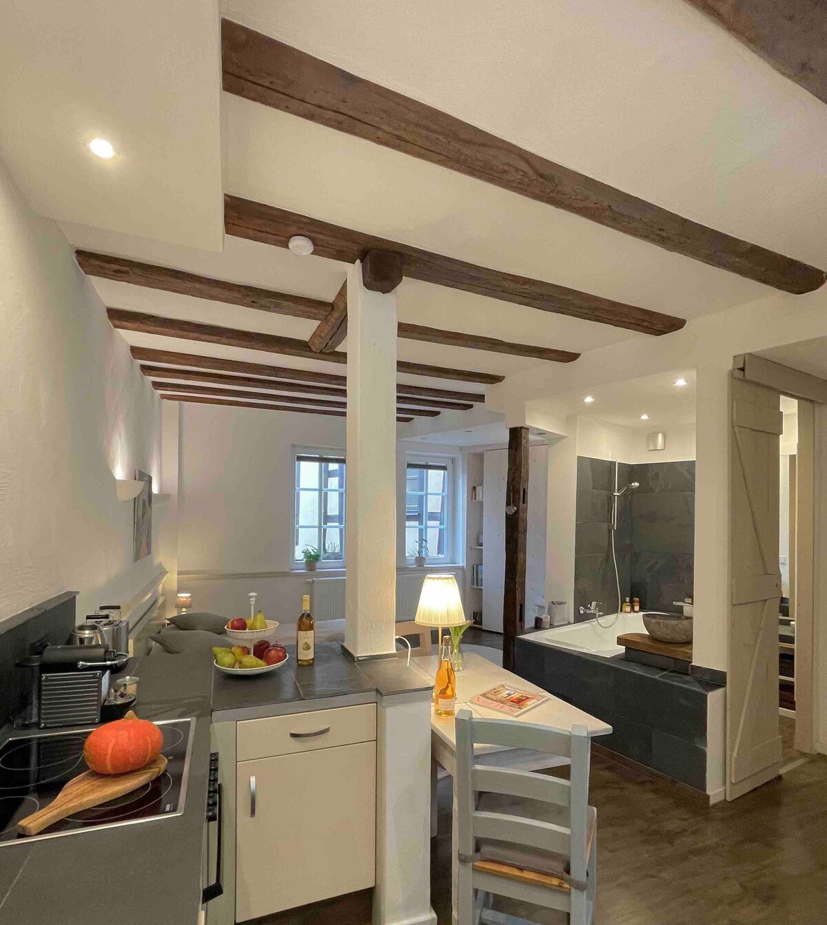 WELCOME HOME. We rent our small apartment to nice people who like to have it nice. The "Schnuckelige" (approx. 30 sqm) is newly renovated, transparently open & furnished with love. You will have peace and quiet with us, even though you live in the middle of the old town. In 5 minutes you are in the city & in the spa area; the baker, a shop with regional products & a supermarket are right around the corner. You also have greenery: the castle park right outside the door - and a private garden.