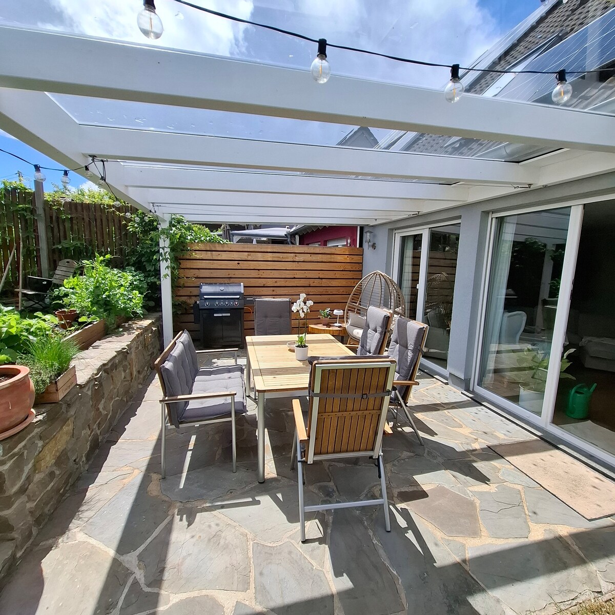 The wooden house is suitable for families and friends with up to 10 adults. The accommodation is located between the "Maare" (volcanic lakes) in the Volcanic Eifel near the Nürburgring and offers: Sauna for 5 people, 2 winter gardens, one with a pop-up pool, outdoor wood heated hot tub, fire pit, play area, trampoline, fitness equipment in the house, table soccer, table tennis in the large double garage, Netflix, wallbox for electric cars. 2 baby travel cots and 2 high chairs are available.