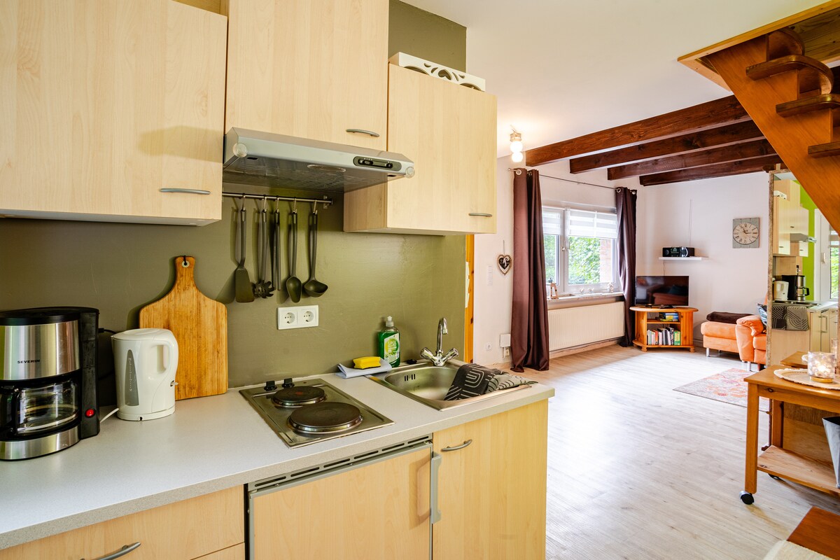 This 62 m2 large apartment is located on the second floor of our original half timbered house. A shared staircase leads to this apartment which consists of a living area with two armchairs, a sofa, a kitchenette with a table and 4 chairs, two bedrooms and a bathroom. Each bedroom has two single beds (adjacent / next to one another) which can be placed together - after consultation, to form a double bed arrangement.