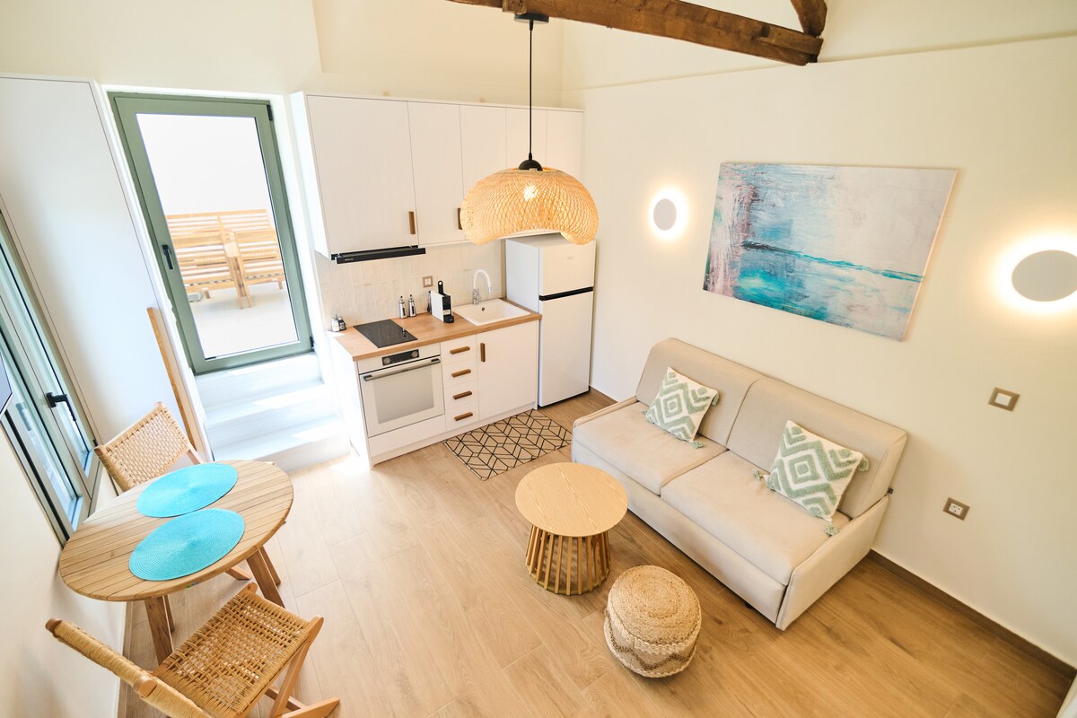 Enjoy a special stay in the old market, next to traditional cafes, authentic taverns, local shops, the historic port and the castle of Mytilene! Our renovated loft combines modern elegance with artistic retro aesthetics, offering a bright, calm atmospheric space, overlooking the traditional cobblestone alleys of the old market. The high-ceilinged spaces, modern design and unique vintage details create a sense of comfort and luxury.