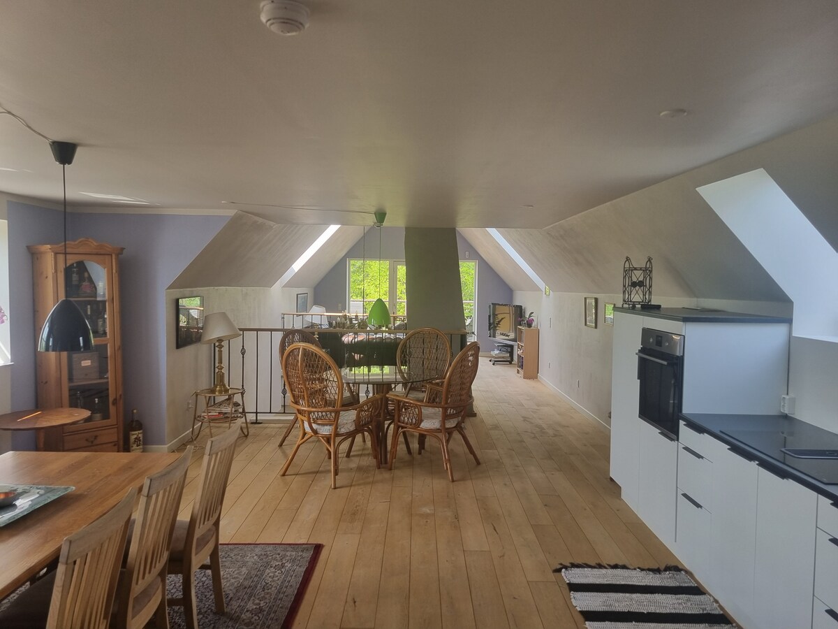 Stor nyistandsat lejlighed i rolige omgivelse nær skov og marker. Lejligheden har egen indgang, og ligger på 1. sal. Mulighed for brug af havemøbler og shelter. Stabilt og hurtigt wi-fi 1 soveværelse med dobbeltseng, og mulighed for at leje ekstra soveværelse, samt hems med dobbeltseng. Weekend seng / barnevogn kan lånes. Incl. sengelinned og håndklæder. God plads til parkering, men ikke mulighed for opladning af elbil. Indkøb 5 km, nærmeste strand 5,3 km, motorvej 9 km.