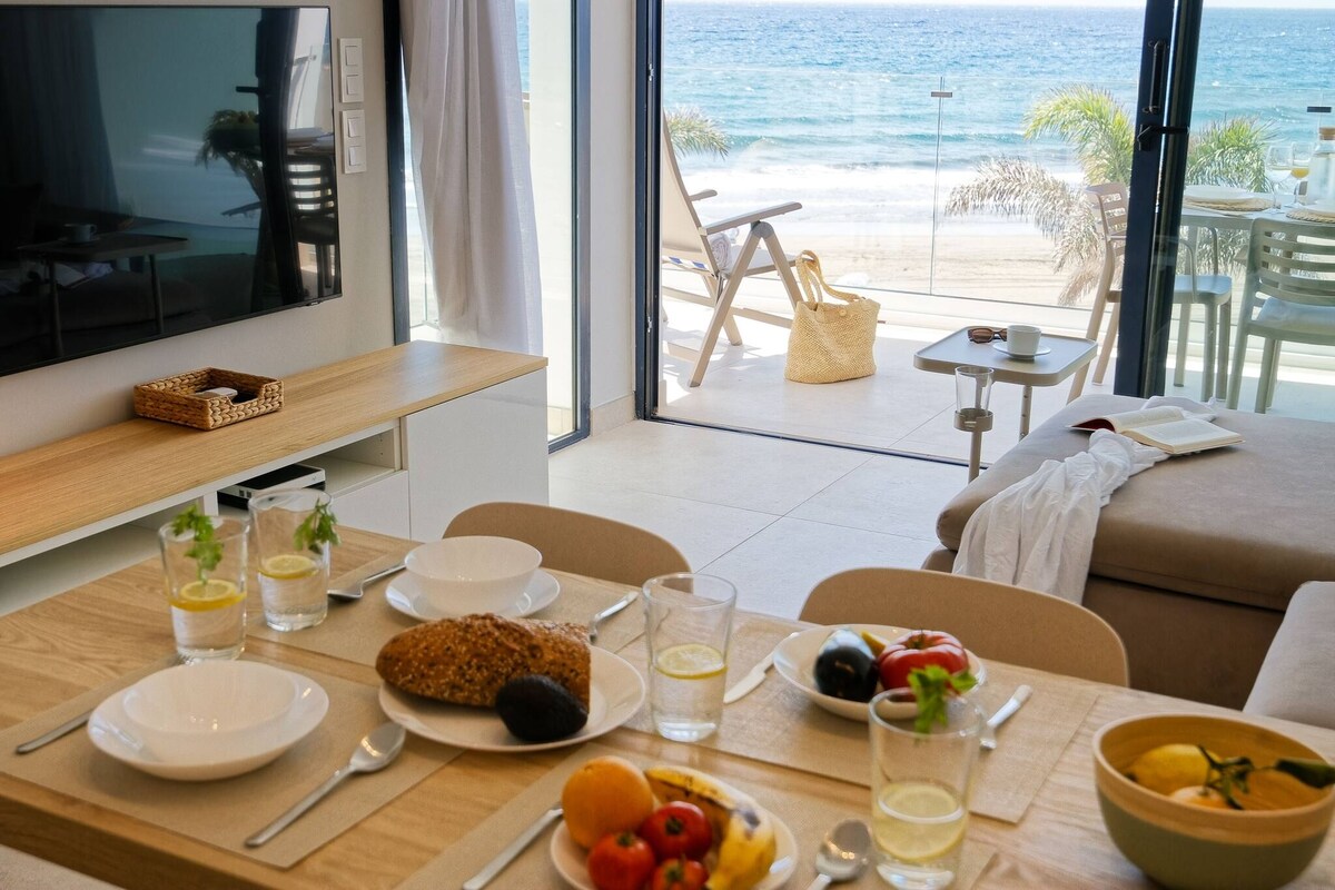 Cosy apartment located on the beachfront. Perfect for quiet vacations. Enjoy the sea view from the balcony and the closeness of the beach. The sand is a few steps from the apartment and the complex has a private access to the beach. The ideal place to escape from the routine and stress, enjoying one of the best sunrises of the island. The apartment is fully equipped so you will have everything you need for your stay. The boho-chic decorated living room has a 65-inch TV and a bed couch. WifiTOP