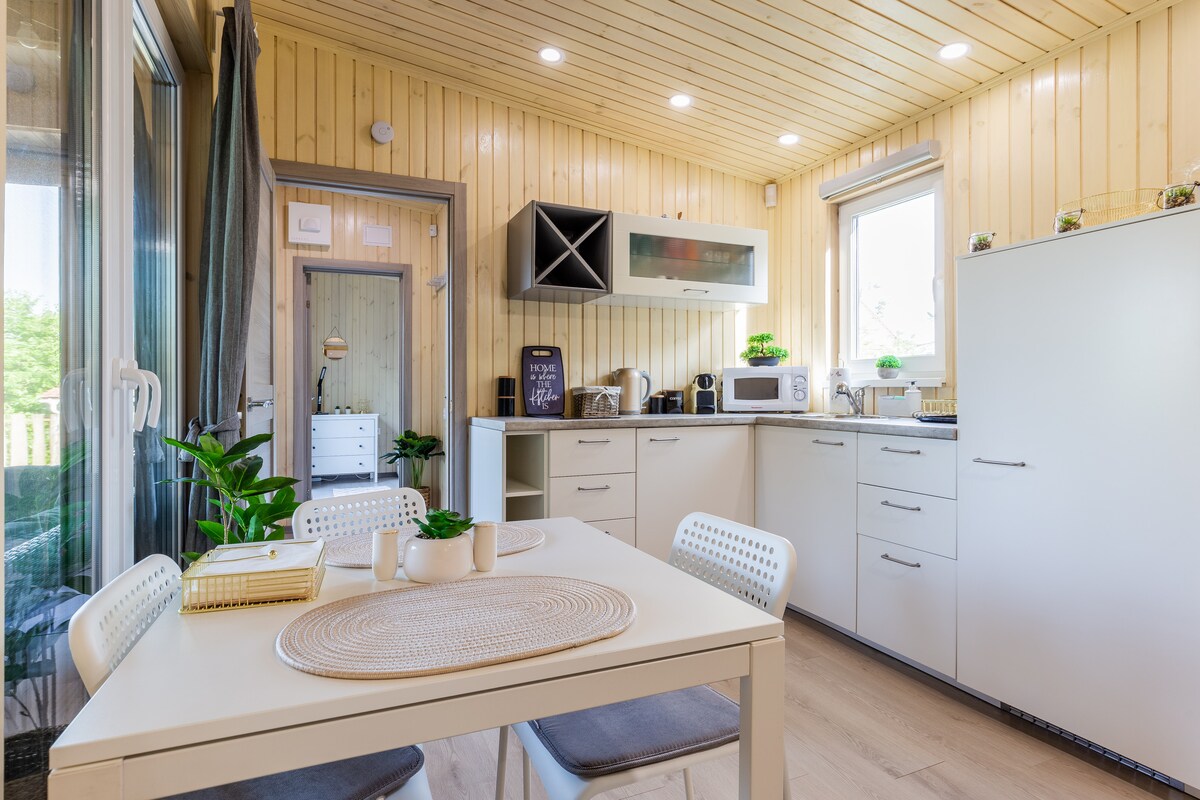 The house has 37 m2: bedroom room, living room with sofa-bed, bathroom with shower, well equipped kitchen. There is also a hot tub on the terrace, available all year round. Recommended for a maximum of 4 people. There is the possibility of baby cot, highchair, pram. On request we can also provide toys for different ages (baby toys, rattles, skill-builders, board games, baby books, books for young people, etc.)